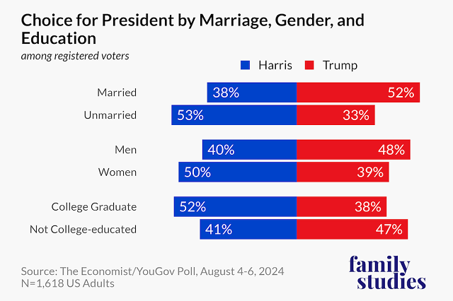 Charlottesville, VA, Oct. 31, 2024 (GLOBE NEWSWIRE) -- New research from the Institute for Family Studies shows a large and growing “marriage gap” between Republicans and Democrats. The marriage gap in support for Harris/Trump, for instance, is about as large as the gender and education gaps in presidential preferences.